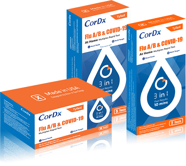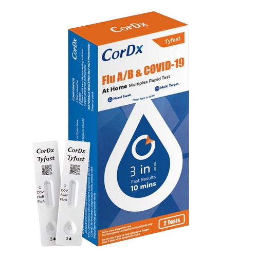The CorDx Tyfast Flu A/B & COVID-19 Multiplex Rapid Test is a lateral flow immunoassay intended for the qualitative detect and differentiate of SARS-CoV-2 and influenza A and B antigens in nasal samples(from both nostrils). The test provides an efficient and accurate diagnostic solution in just 10 mins, giving people fast way to prioritize their health.